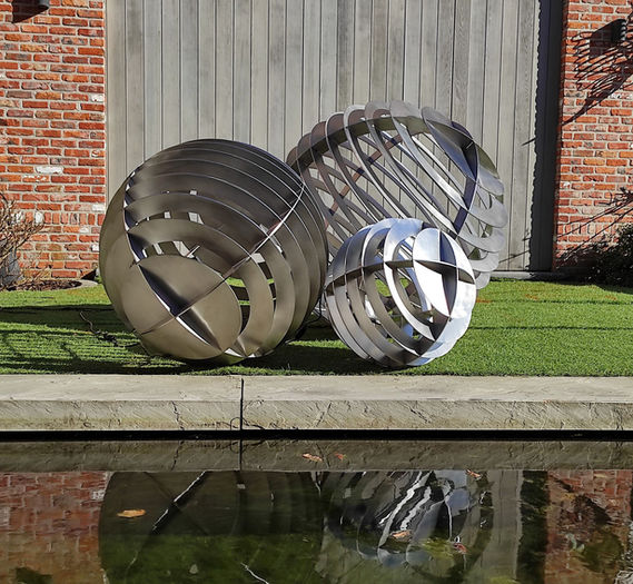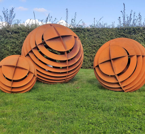 Deze lichtbollen in cortenstaal zijn voorzien van een instelbare LED verlichting die te bedienen is via een afstandsbediening. Alle kleuren te zien op deze foto's kan u zelf kiezen.